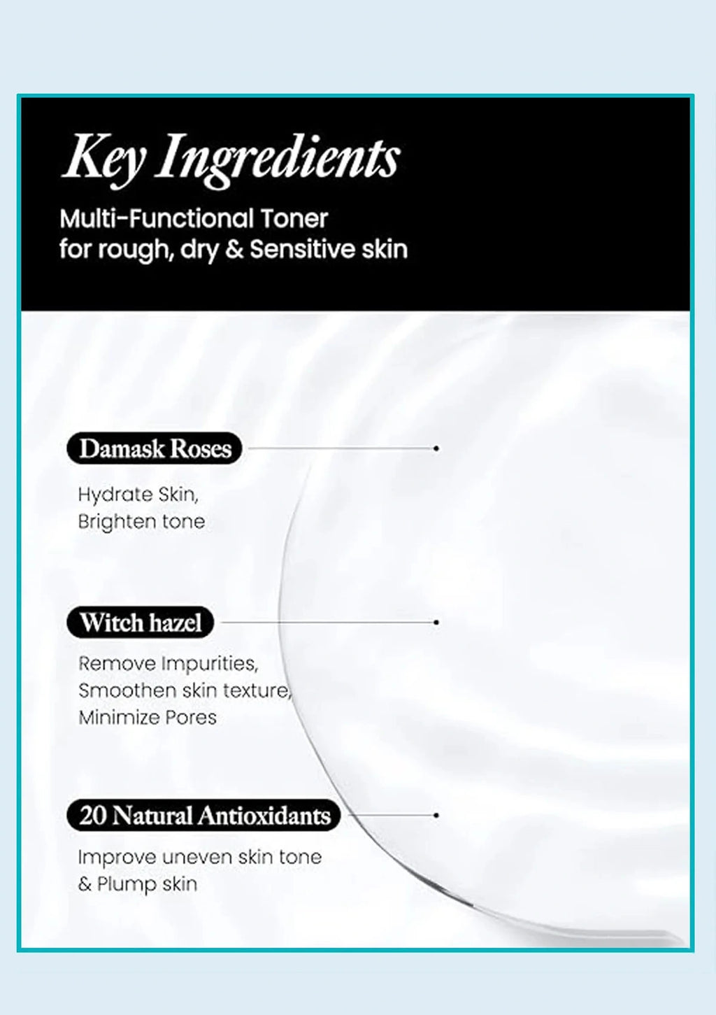 Water, Rose Damascena Flower Water, Citrus Aurantium Dulcis Orange Fruit Extract, Hamamelis Virginiana Water, Butylene Glycol, Propanediol PEG-7 Caprylic/Capric Glycerides, Alcohol Denat., Xylitol, Phenoxyethanol, Decyl Glucoside, PEG-40 Hydrogenated Castor Oil, PPG-26-Buteth-26, Sodium Chloride, Sodium Citrate, Citric Acid, Citrus Aurantium Bergamia (Bergamot) Fruit Oil, Olea Europaea (Olive) Fruit Oil, Citrus Aurantium Dulcis (Orange) Peel, Citrus Granolis Grapefruit Peel oil, Lavandula Angustifolia (Lavender) Oil, Cedrus Atlantica Bark Oil, Pelargonium Graveolens Flower Oil, Lavandula Angustifolia (Lavender) Water, Carica Papaya (Papaya) Fruit Water, Copaifera Officinalis (Balsam Copaiba) Resin, Jasminum Officinale (Jasmine), Illicium Verum (Anise) Fruit/Seed Oil, Sodium Lactate, Sodium PCA, Artemisia Absinthium Extract, Rose Flower Oil, Propylene Glycol, Thuja Occidentalis Leaf Extract, Ferula Galbaniflua (Galbanum) Resin Oil, Malic Acid Sucrose Urea, Tartaric Acid, Origanum Majorana Leaf Extract, Lavandula Angustifolia (Lavender) Flower/Leaf/Stem Extract, Melissa Officinalis Leaf Extract, Rosmarinus Officinalis (Rosemary) Leaf Extract, Salix Nigra (Willow) Bark Extract, Pelargonium Graveolens Extract, Mentha Rotundifolia Leaf Extract, Origanum Vulgare Leaf Extract, Eucalyptus Globulus Leaf Extract, Melaleuca Alternifolia (Tea Tree) Leaf Extract, Mentha Piperita (Peppermint) Leaf Extract, Thymus Vulgaris (Thyme) Leaf Extract, Mentha Spicata Flower/Leaf/Stem Extract, Benzyl Alcohol, Chlorphenesin, Methylparaben, Dehydroacetic Acid, Butylparaben, Ethylparaben, Isobutylparaben, Propylparaben.