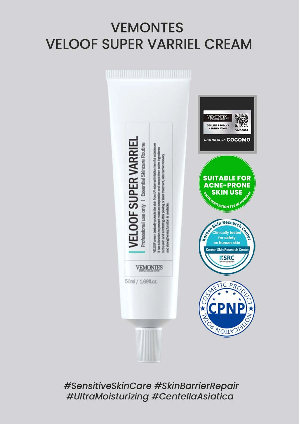 Vemontes Veloof Super Varriel Cream is an intensive regenerating cream designed to repair, protect, and strengthen the skin’s natural barrier. Formulated with 470,000 ppm of Centella Asiatica Extract as its base instead of purified water, it delivers powerful soothing, deep hydration, and recovery to stressed, sensitive, or post-procedure skin.