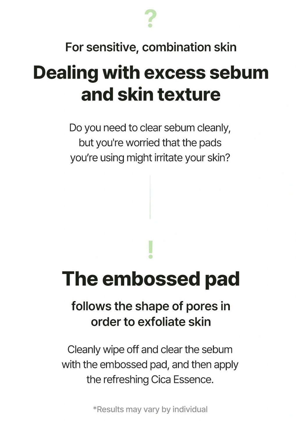 Vegan-certified fabric with an embossing pattern that closely resembles the skin, cleans and gently wipes every corner of your skin, leaving you with smooth skin every day. Mildly acidic, low-irritation keratin care ingredients, LHA, and PHA gently remove unnecessary sebum and old keratin, while the refreshing Cica essence soothes the skin.
