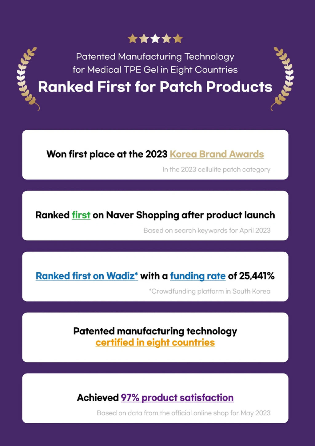 The SL Light Trapezius Patch is meticulously crafted to redefine your well-being. Backed by extensive research and developed by the renowned Kim Se-eun, this groundbreaking product has garnered international acclaim, winning first place in the 2023 Korea Brand Awards and achieving top rankings on the Naver Shopping and Wadiz crowdfunding platforms. This patch boasts patented manufacturing technology for its Medical TPE Gel, which is certified in eight countries and has become a leader in the patch product market.
