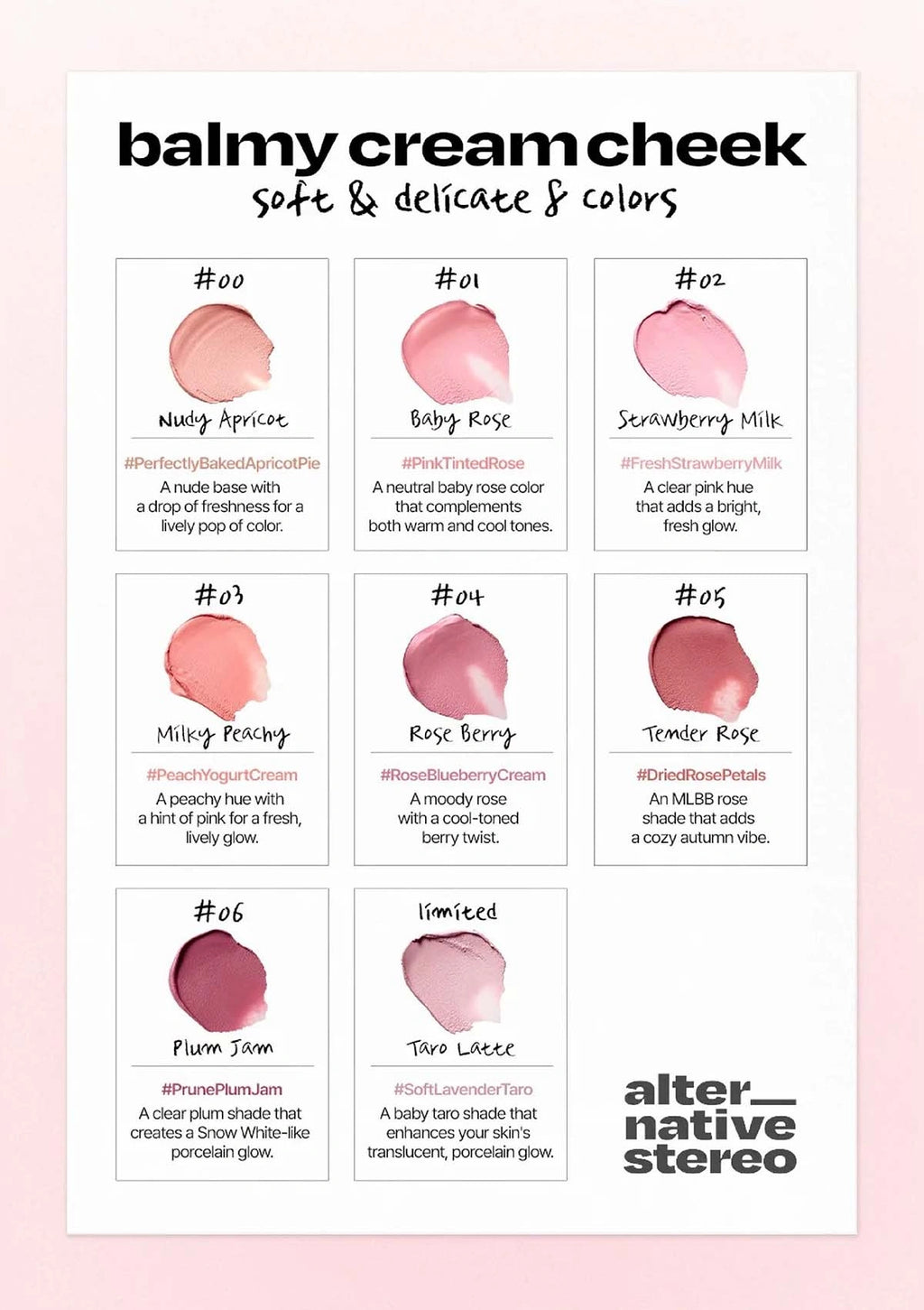 Elevate your glow with the Alternative Stereo Balmy Cream Cheek, a silky, skin-blurring blush that melts effortlessly into the skin for a soft, natural flush. Available in 8 dreamy rose-toned shades, each with a hint of milky warmth, this cream blush flatters all skin tones and undertones — from cool to warm and everything in between.