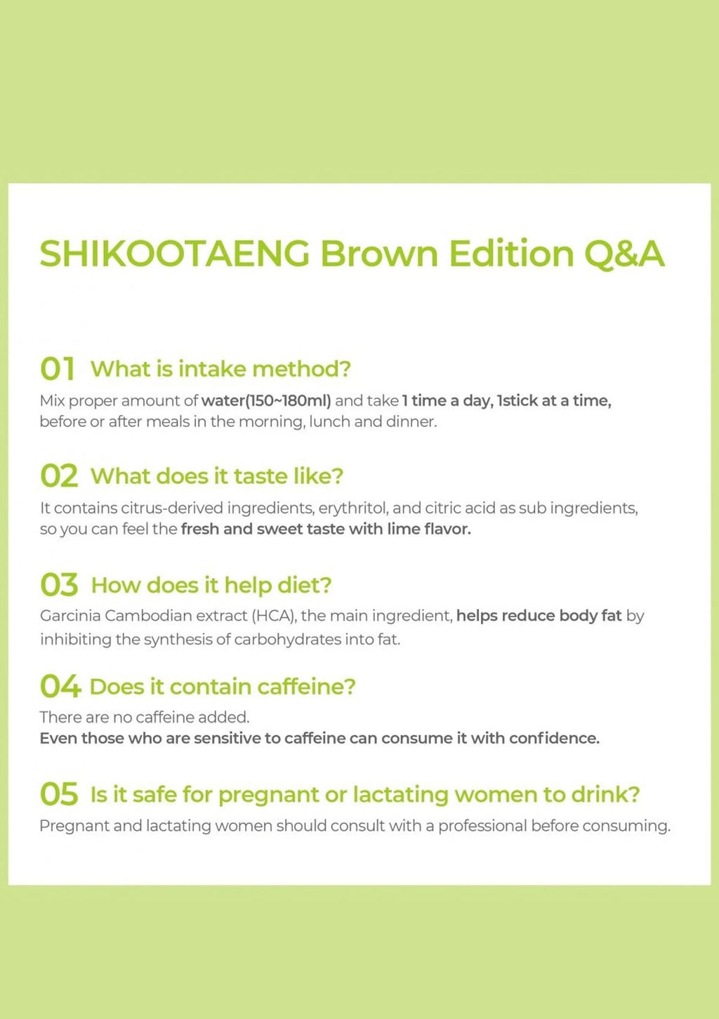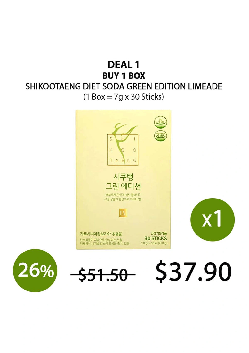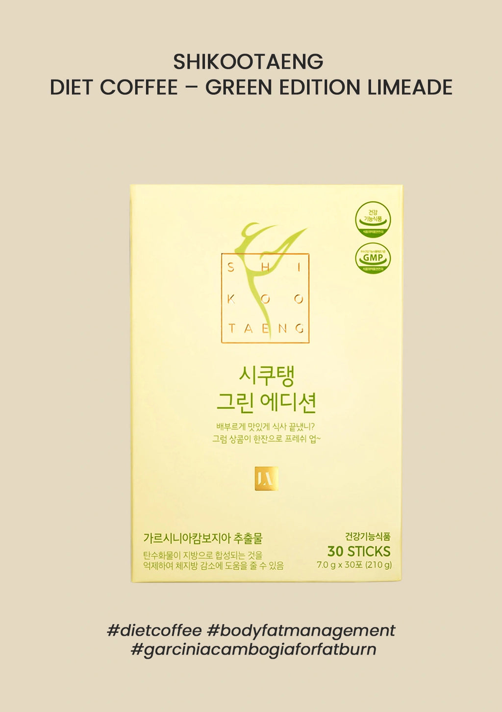 The Shikootaeng Diet Soda – Green Edition Limeade is a tasty lime-flavored caffeine-free treat for those looking to lose weight in a healthy and nourishing manner. It delays carbohydrate digestion which aids in weight loss. It also reduces the size of visceral fat cells while promoting fat consumption! 1 stick (7g) only adds 25 kcal!