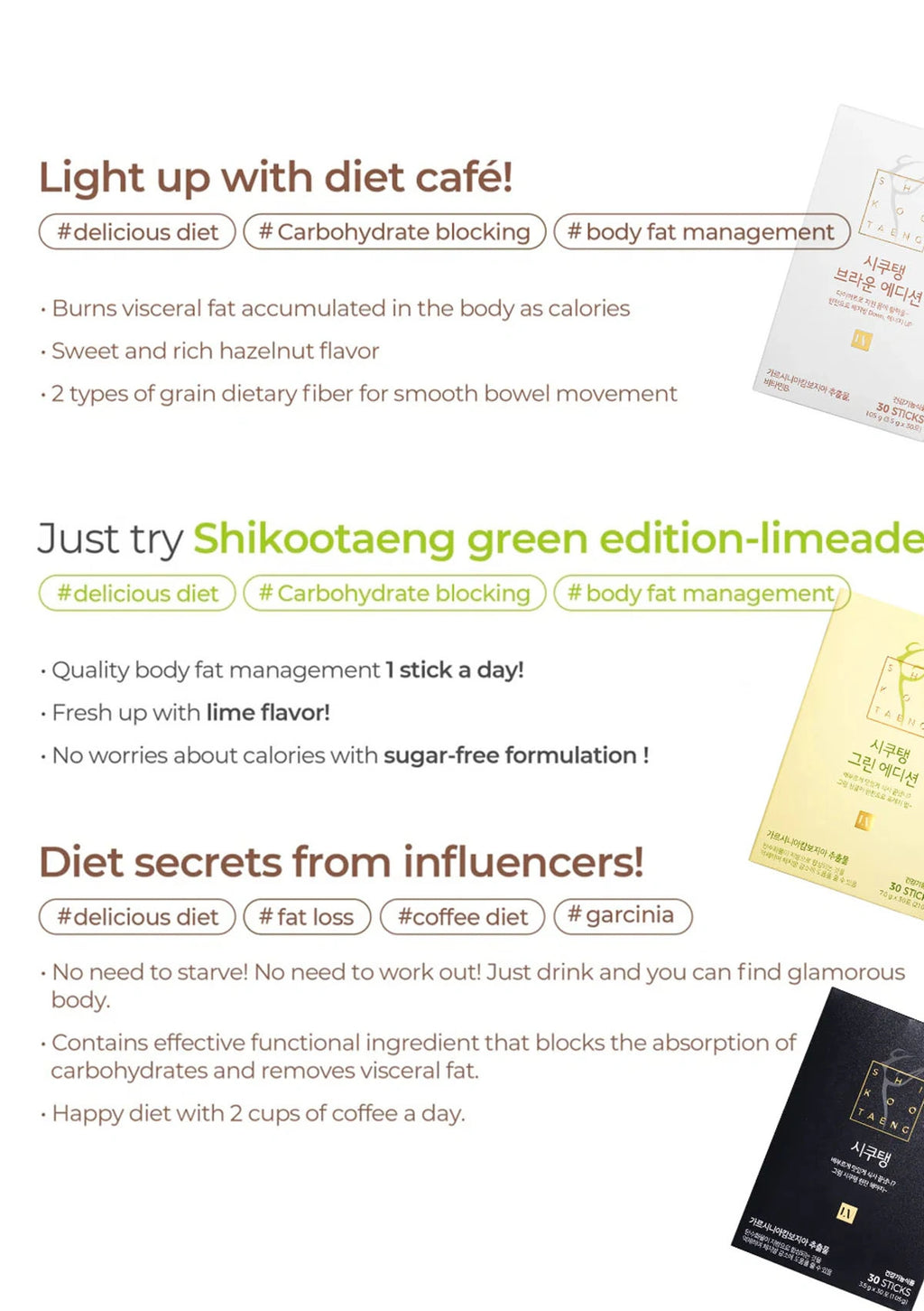 It improves your blood sugar levels, cholesterol levels, and brings down your blood pressure. Weight loss, decreases joint pain, back pain, and improves your mobility. From a lifestyle perspective, it improves your energy levels, sleep, confidence, mood, and sex life. You have to deal with lower amounts of stress and have a positive body image of yourself. That is why we have our ShikooTaeng waiting to join you from this week — 2 diet coffees & 1 diet soda!