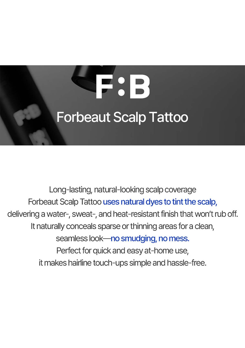 ForBeaut Scalp Tattoo is an advanced, at-home scalp tint solution designed to instantly conceal thinning areas like the crown, part line, and M-shaped hairline. Formulated in a natural black shade that blends seamlessly with Korean hair tones, it features a built-in gua sha roller for smooth, precise, and mess-free application. The thick, no-drip texture ensures effortless use—even in hot, humid weather—making styling simple and clean.