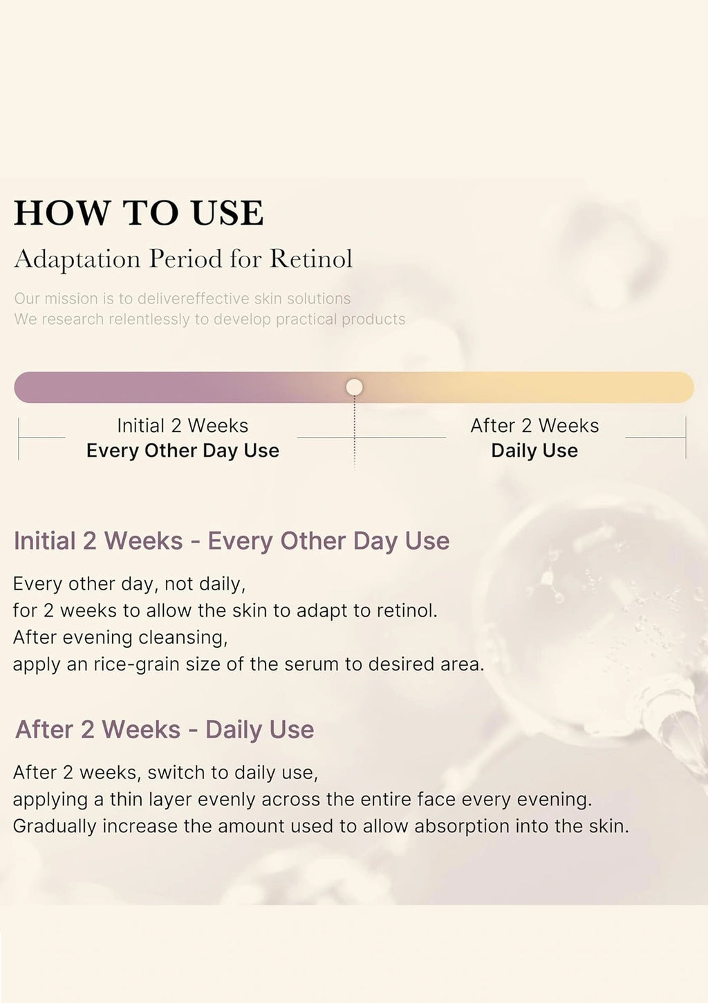 1. Apply the product in the evening after cleansing and toning. For the first two weeks, apply the serum every other day to get your skin used to the effects of retinol.
