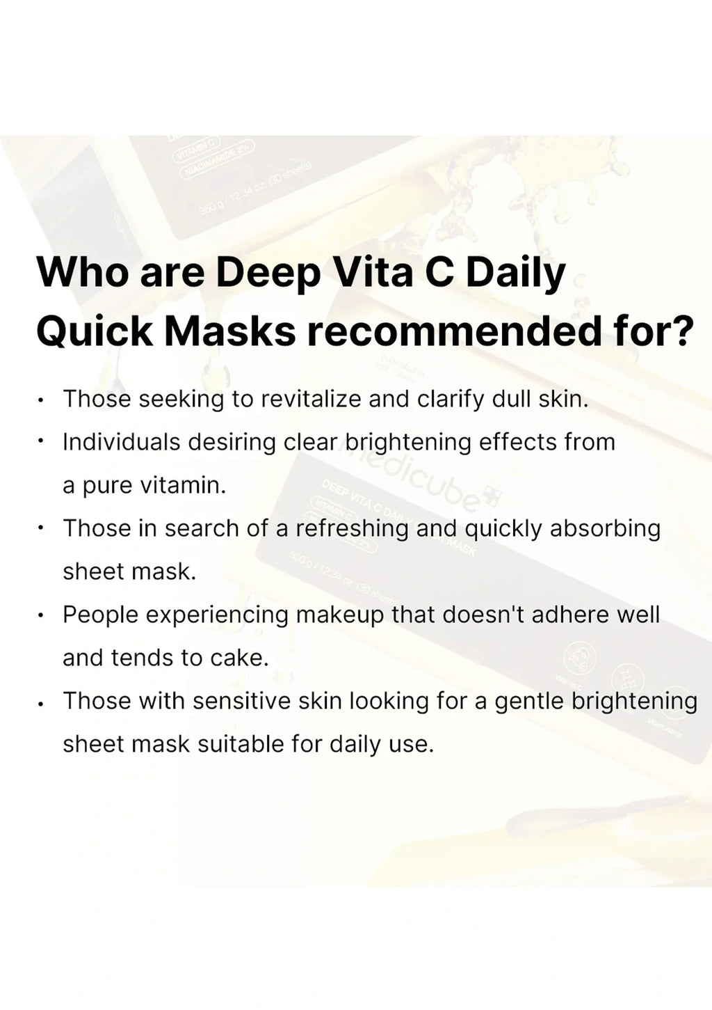 Medicube Deep Vita C Daily Quick Masks are specially formulated sheet masks designed to provide an instant boost of brightness and hydration to the skin. Enriched with a potent blend of Vitamin C and other skin-loving ingredients, these masks target dullness and uneven skin tone, delivering visible results in just 60 seconds.