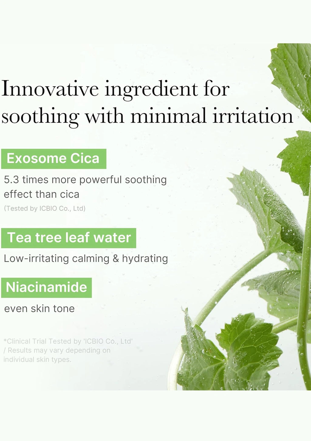 Advertisement for Exosome Cica, Tea tree leaf water, and Niacinamide with a plant image on a white background.