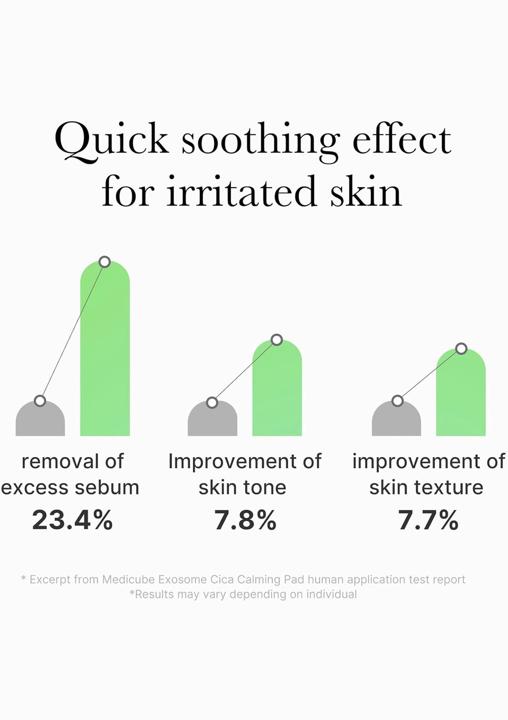 Bar chart showing the quick soothing effect for irritated skin with percentages for removal of excess sebum, improvement of skin tone, and improvement of skin texture.