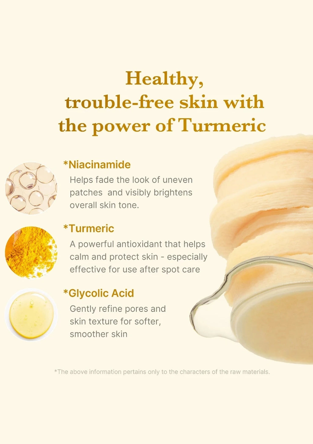 Formulated with gentle exfoliating acids such as glycolic acid and salicylic acid, the pads help lift away dead skin cells while keeping skin hydrated and comfortable. Turmeric and soothing agents help calm the look of redness, making the pads suitable for daily use even on sensitive or stressed skin.