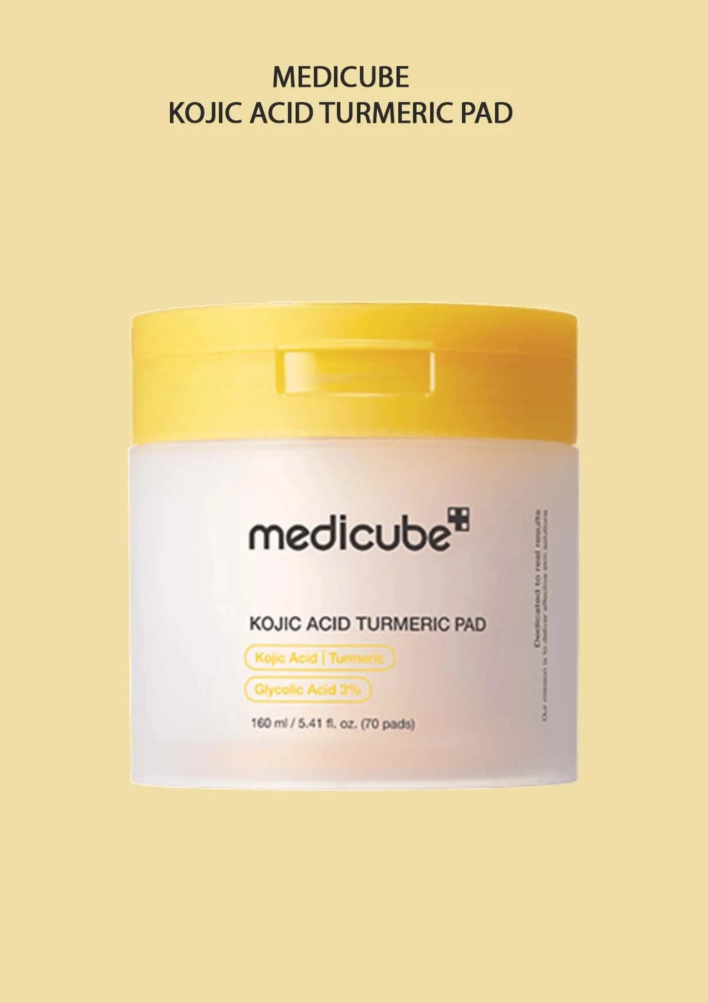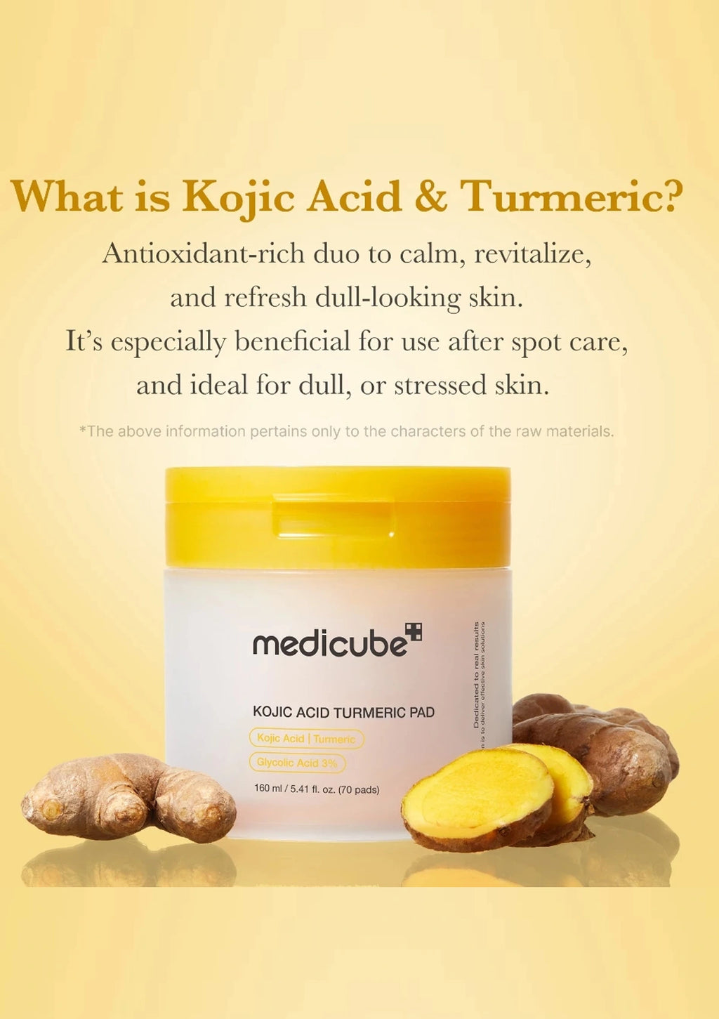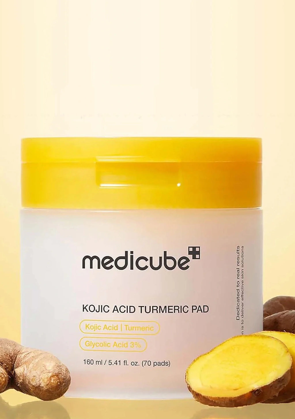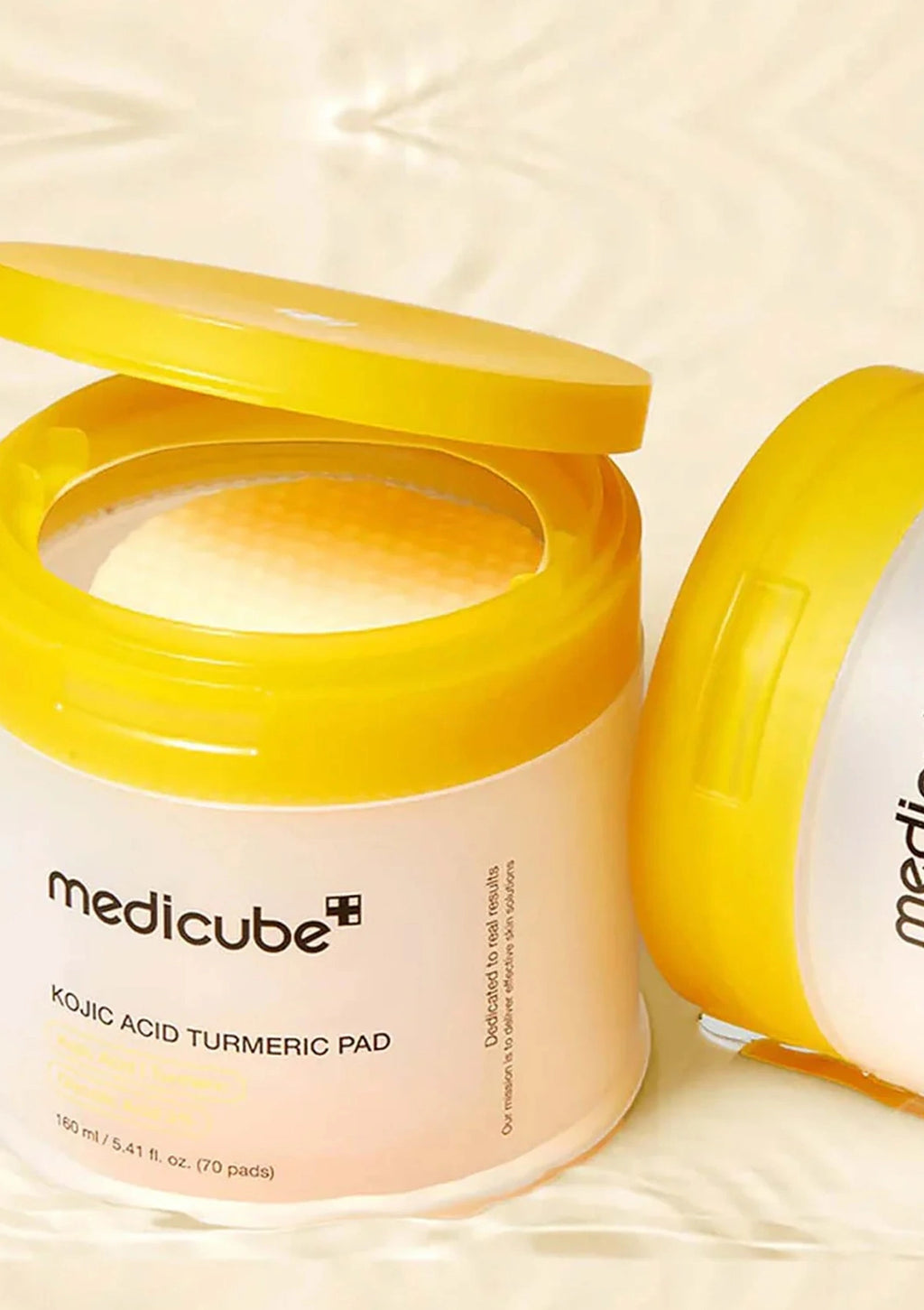 Medicube Kojic Acid Turmeric Pad is a set of pre-soaked toner pads designed to brighten uneven skin tone, refine pores and smooth skin texture in one easy step. Infused with kojic acid, niacinamide and turmeric root extract, these pads help improve the appearance of dark spots, post-blemish marks and dull-looking skin.