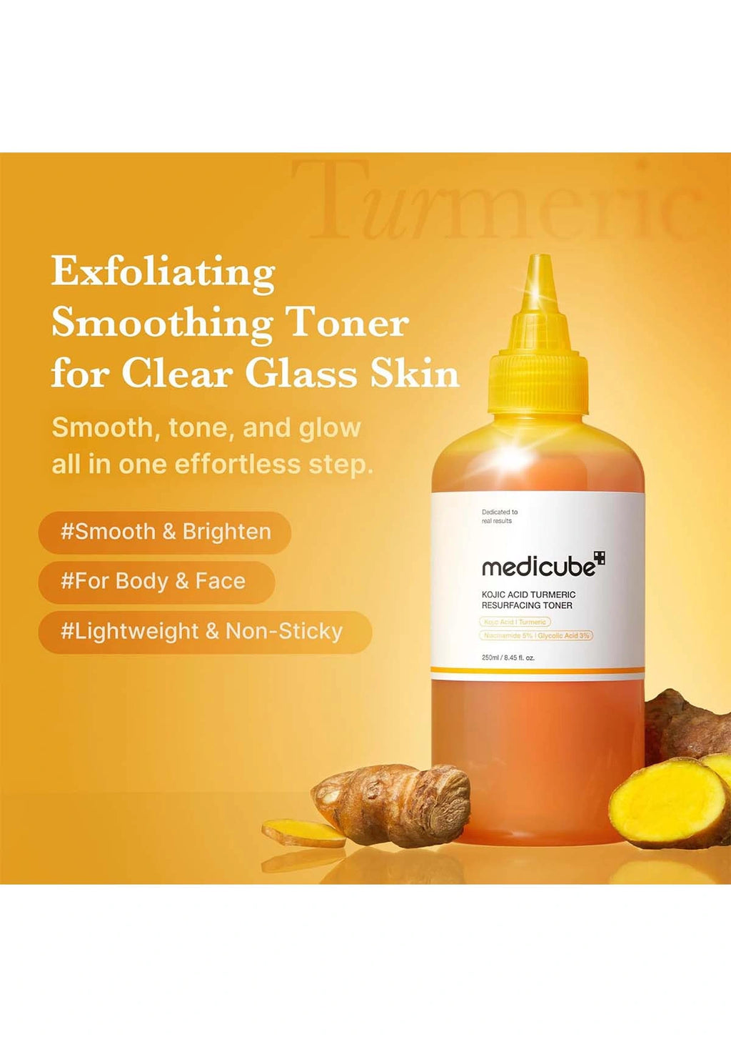 Medicube Kojic Acid Turmeric Resurfacing Toner is a multi-benefit brightening and resurfacing toner that helps even out skin tone, refine texture, and boost radiance with every use. Powered by Kojic Acid and Turmeric extract, it targets the appearance of dark spots, uneven tone, and dullness while delivering antioxidant protection and calming benefits. Infused with Niacinamide and Glycolic Acid, this lightweight, fast-absorbing toner gently exfoliates to smooth rough patches, minimize the look of pores, and prepare skin for deeper absorption of your serums and moisturizers.