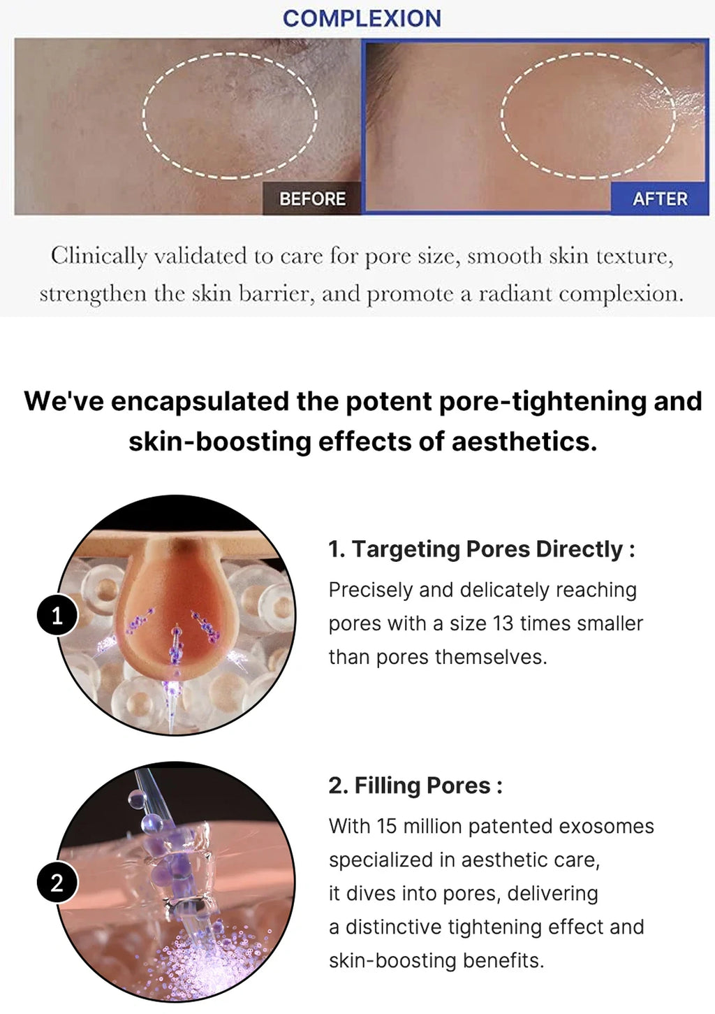 The Exosome Shot Pore Ampoule 7500 takes pore care to the next level with its unique Exosome-coated spicules that penetrate 10 layers of the skin. The formula immediately tightens pores, enhances vitality, and ensures deep absorption of active ingredients, improving absorption by 262%. With a fresh, non-sticky texture, this ampoule visibly reduces pore volume by 23.36% after a single use, with effects lasting up to 3 days.