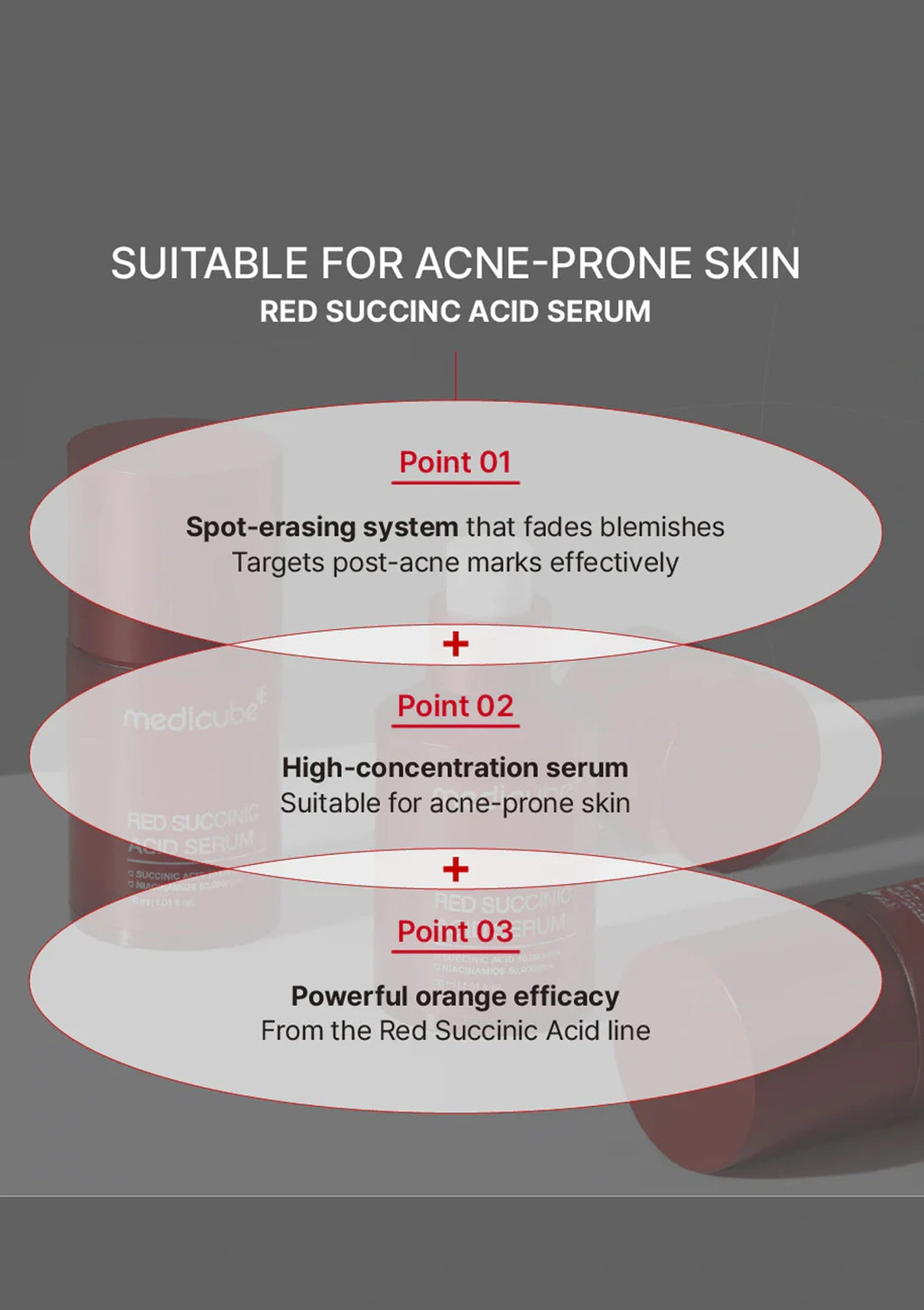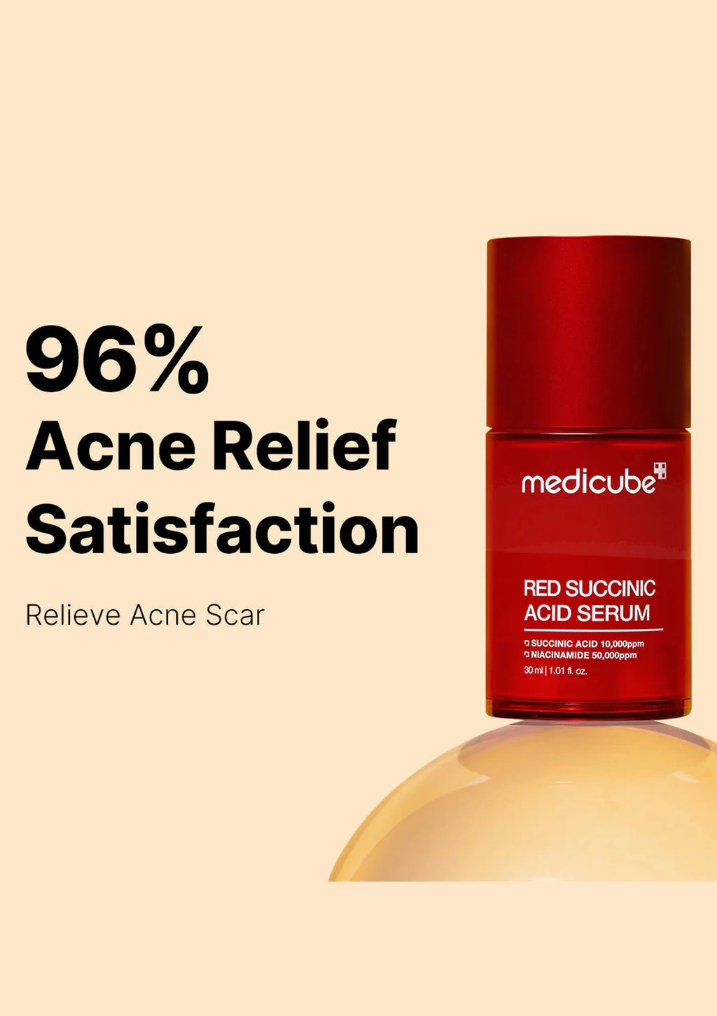 Red succinic acid serum bottle with 'medicube' branding on a beige background, featuring text about acne relief.
