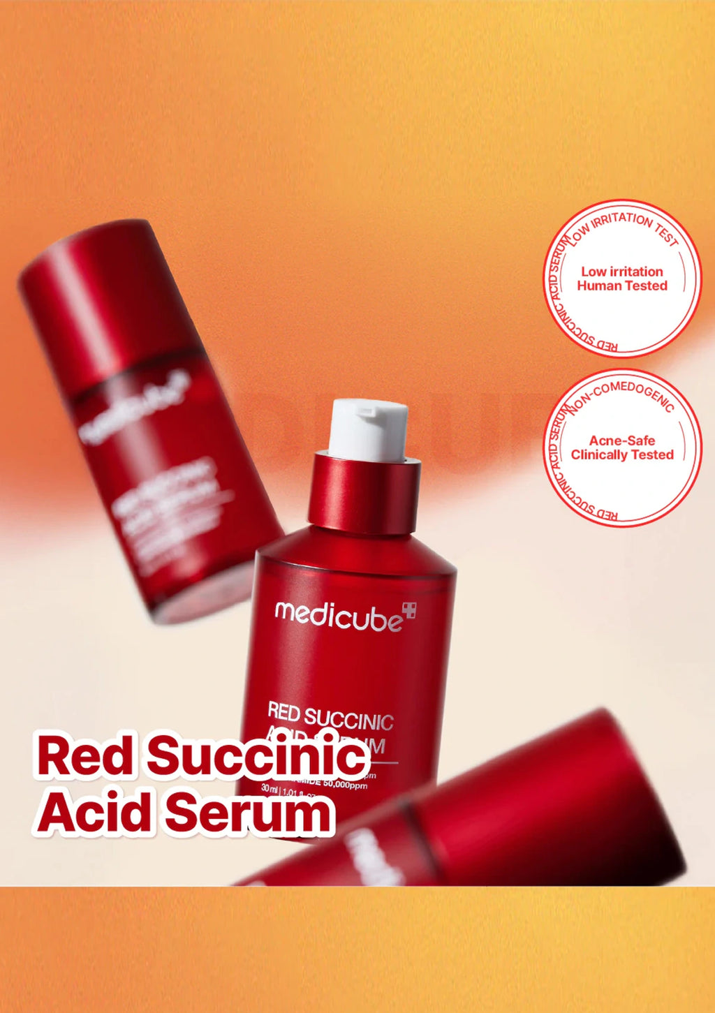 Red Succinic Acid Serum bottles with 'medicube' branding on an orange gradient background.