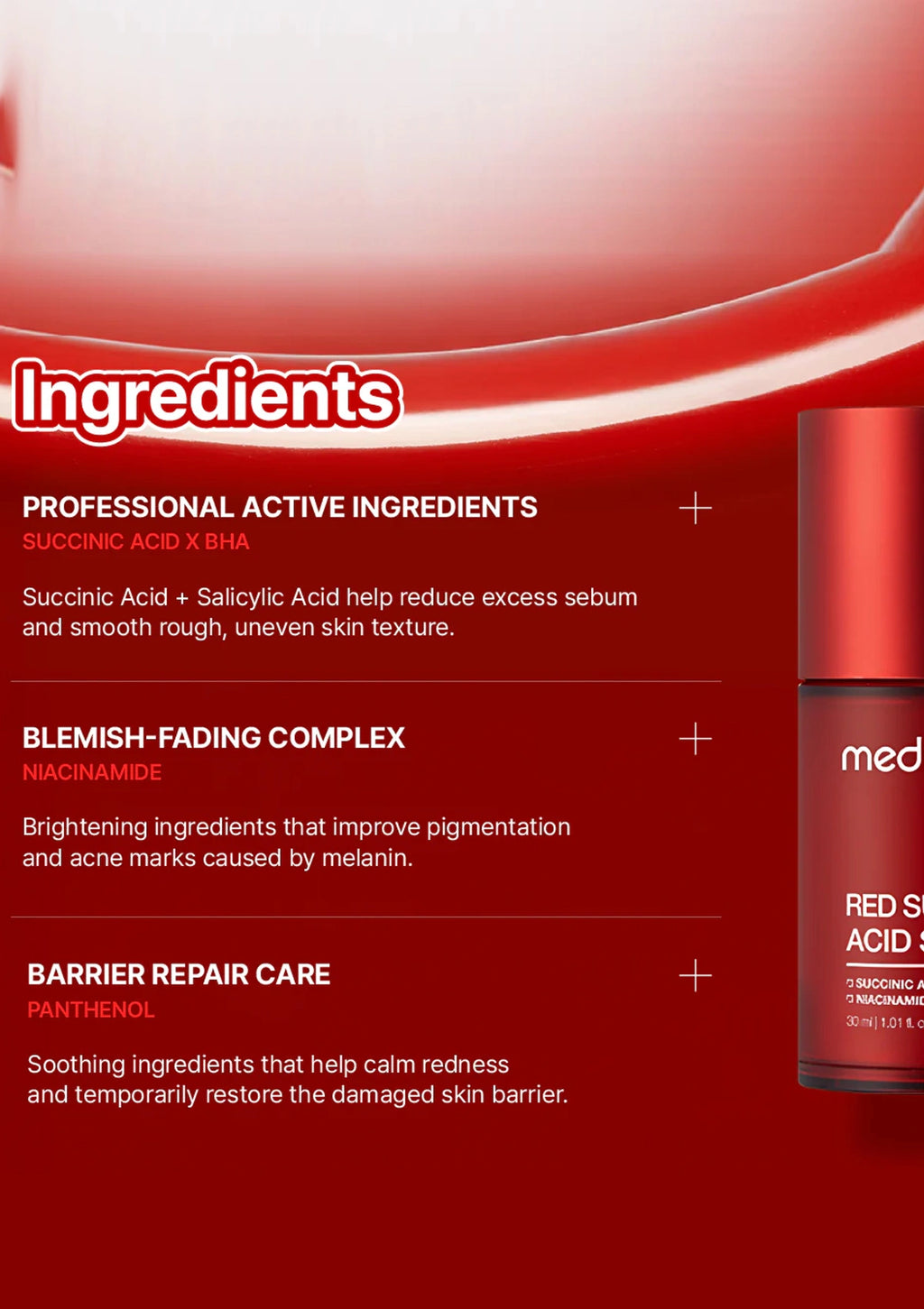 Red succinic acid serum bottle with product details on a red and white background