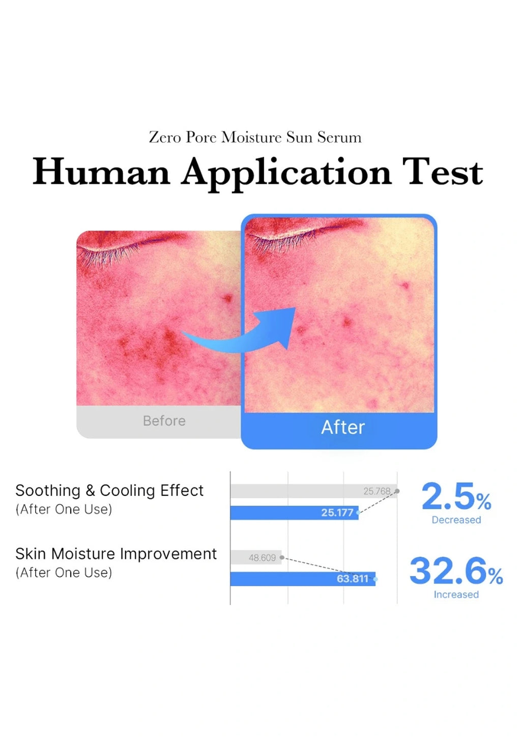 Before and after skin application test of Zero Pore Moisture Sun Serum with statistical data on soothing and cooling effect.