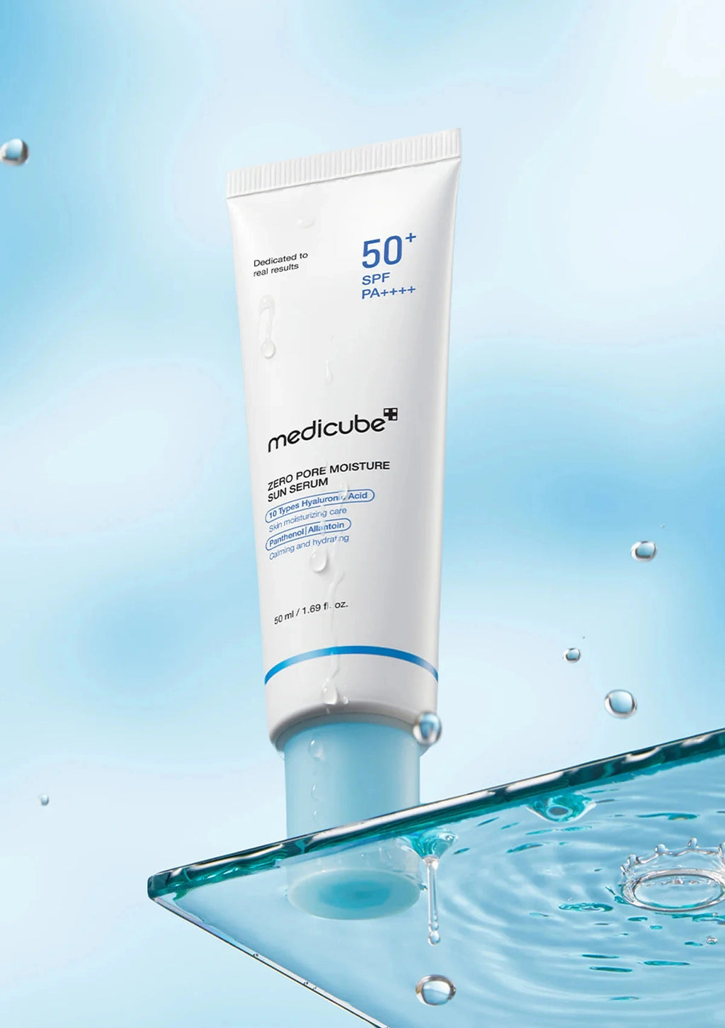 Medicube Zero Pore Moisture Sun Serum with product details on a light blue background