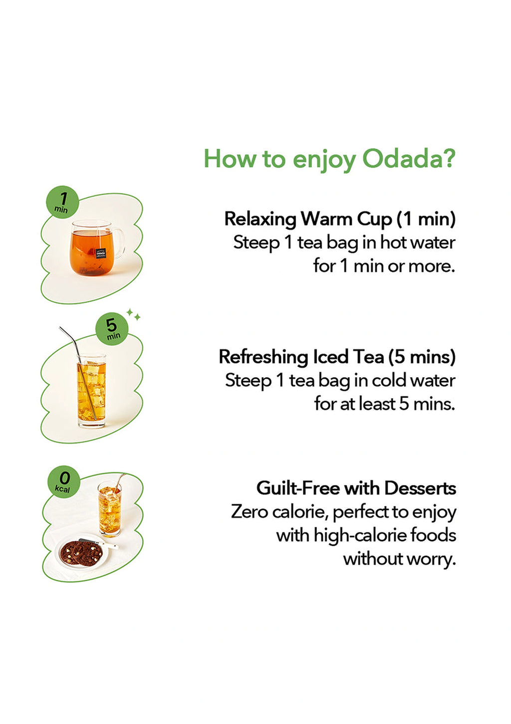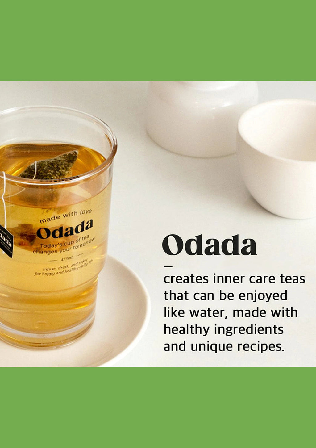 Ginger 50% (Korea), Lotus root 20% (Korea), Fig 15% (Indonesia), Roselle 15% (Chile).Nutrition facts label and green tea package with 'Odada' branding on a green background