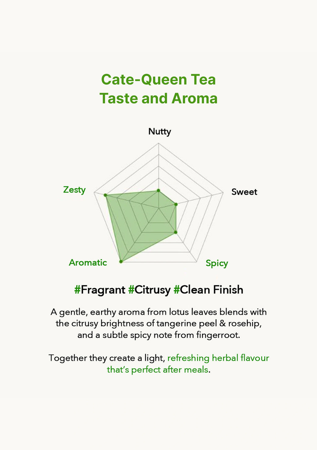 Each sip delivers a gentle, natural aroma from lotus leaves, bright citrus notes from tangerine peel and rosehip, and a light, spicy touch of fingerroot, making it a fresh, pleasant tea you’ll enjoy after meals. Free from synthetic ingredients and packed in eco-friendly PLA triangle tea bags with no microplastics, Cate-Queen Tea offers a calm, sustainable, and enjoyable way to care for your body every day.