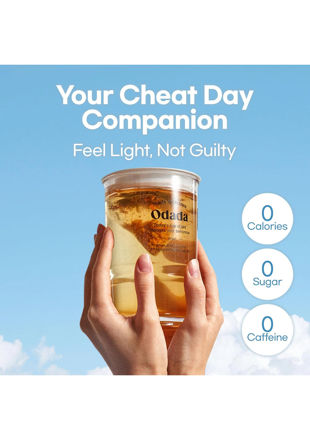 Hand holding a glass of Odada drink with a blue sky background and text about being a 'Cheat Day Companion'.