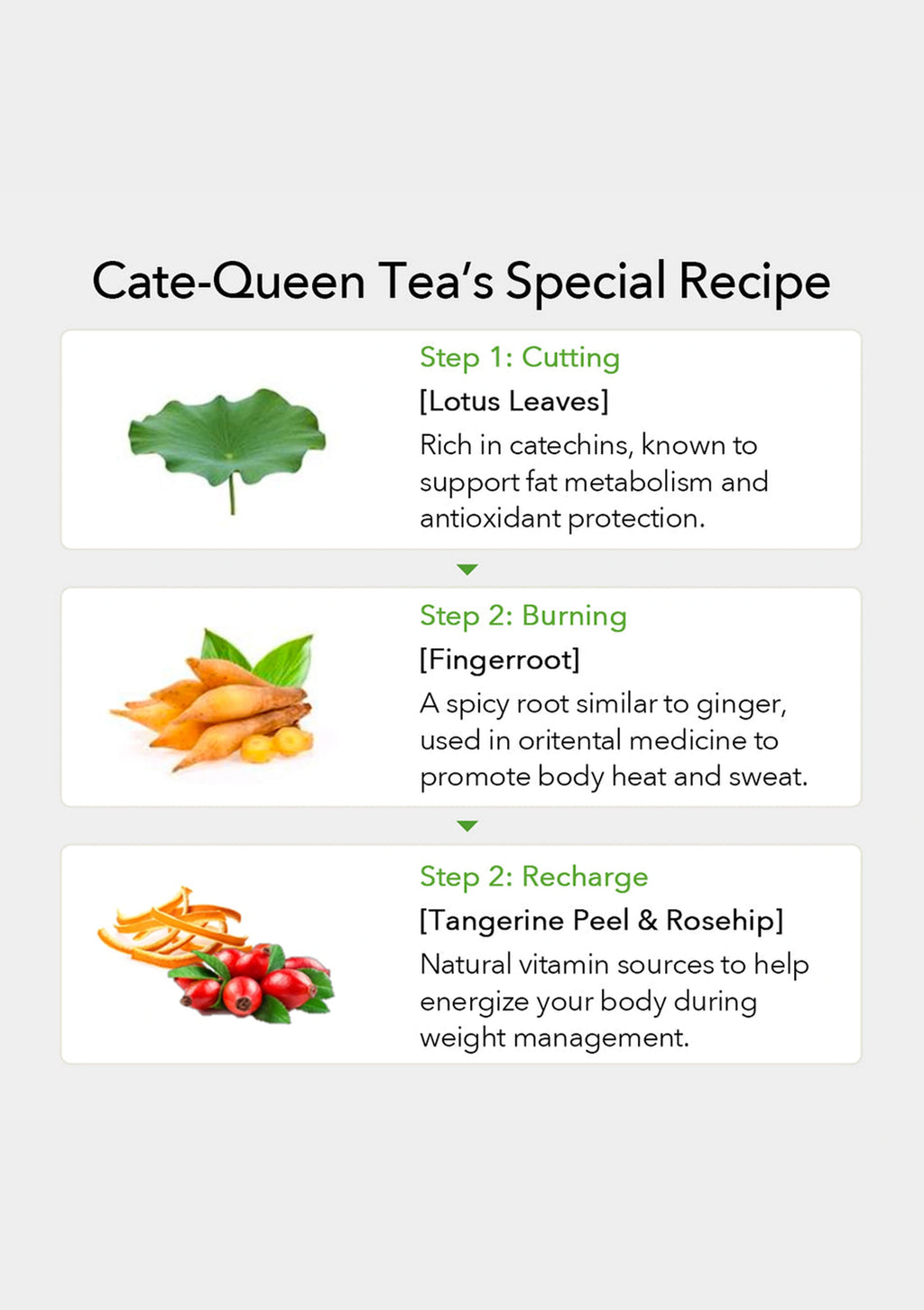 Cate-Queen Tea's Special Recipe with ingredients and benefits on a white background
