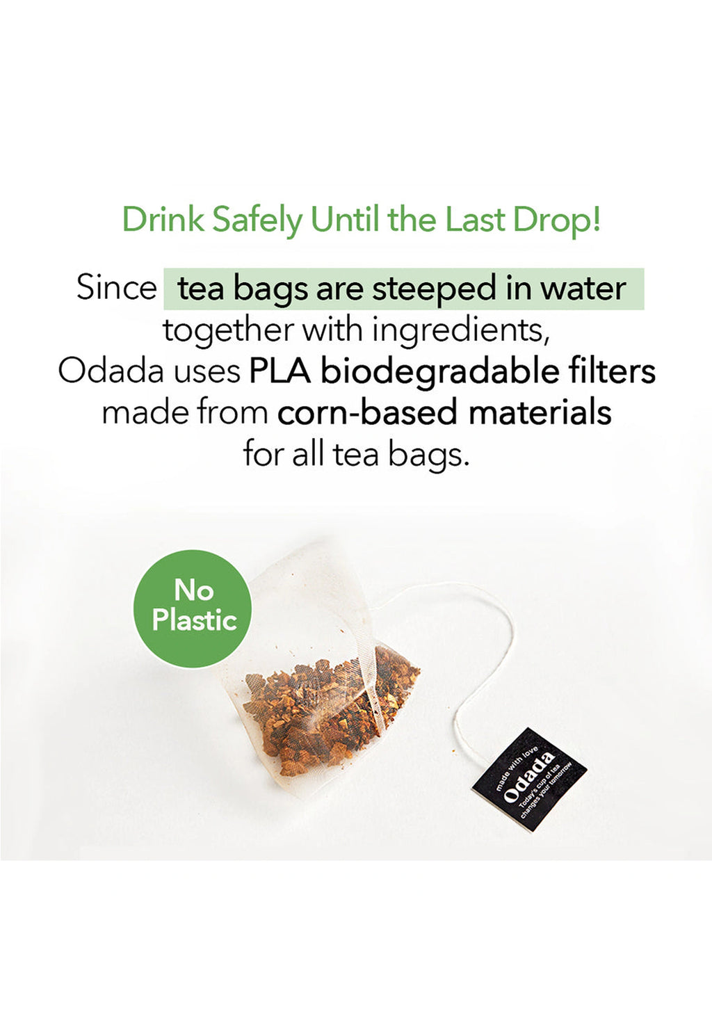 Tea bag with Odada label and text about PLA biodegradable filters on a white background