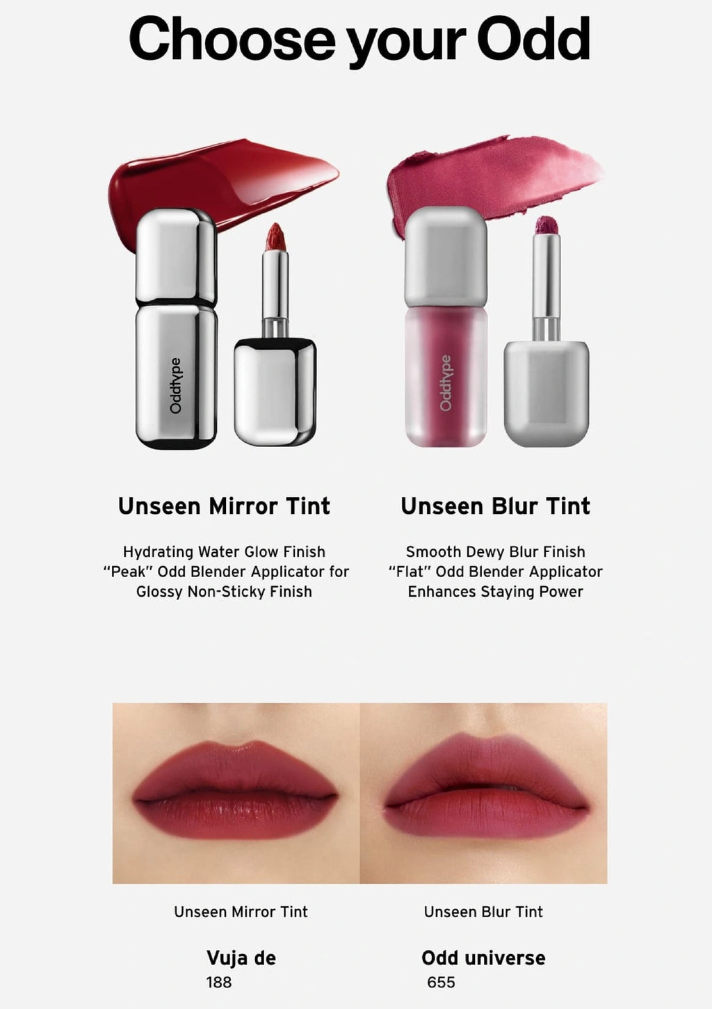 OddType Unseen Mirror Tint is a high-gloss, non-sticky lip tint that delivers hydration and long-lasting color with a lightweight feel. Its Peak Odd Blender applicator ensures effortless precision, while the Water Glow formula creates a plump, dewy effect. Encased in sleek, futuristic packaging, it enhances lips with clear, pigmented shades that balance moisture and shine.