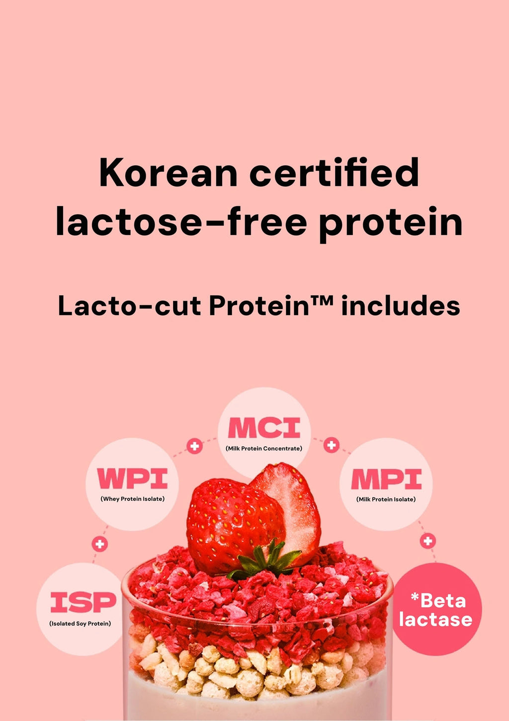 Korean certified lactose-free protein product with strawberry and protein powder on a pink background