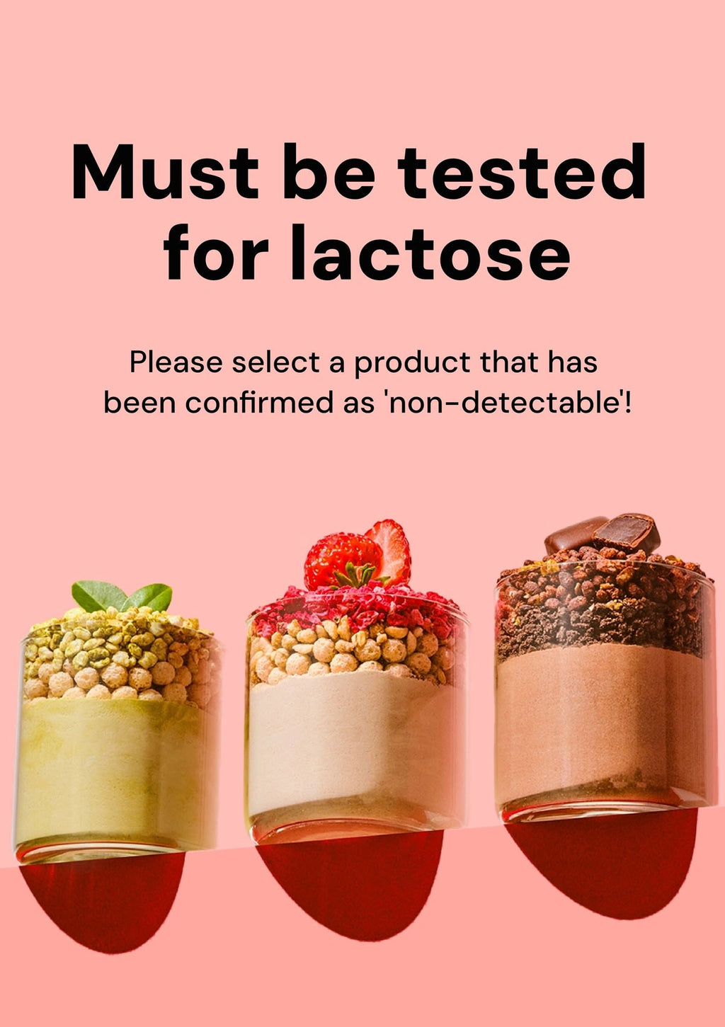 Three dessert cups with text indicating lactose testing requirement on a pink background