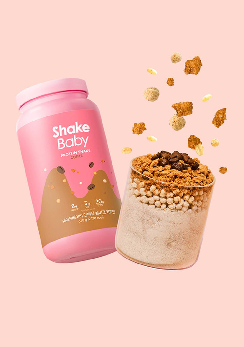 Pink 'Shake Baby' protein shake container with a coffee -flavored shake ingredient label