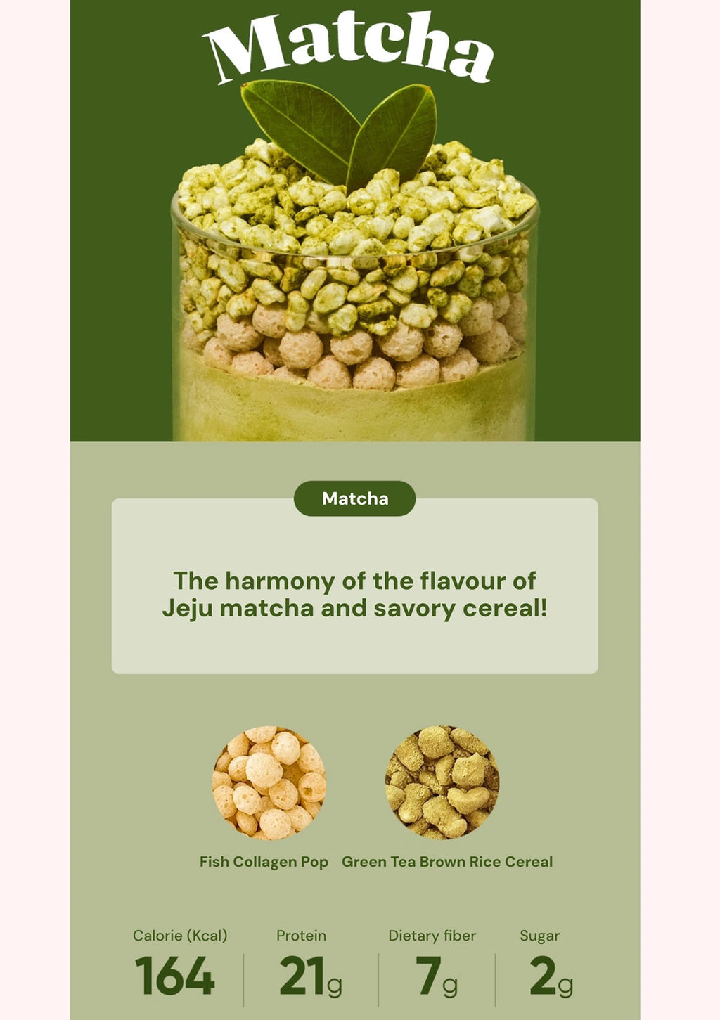 A delicious and nourishing shake made with premium Jeju-grown matcha, delivering a smooth, nutty flavour with every sip. It’s topped with crunchy green cereal and fish collagen balls to add texture and nutrition. Each serving provides 164 kcal, 21 grams of high-quality protein, 7 grams of dietary fiber, and only 2 grams of sugar, making it ideal for weight management, muscle recovery, or a healthy daily meal. Shake Baby Matcha is light yet satisfying, perfectly balanced to fuel your body and your day — whether you're working out or simply staying well.