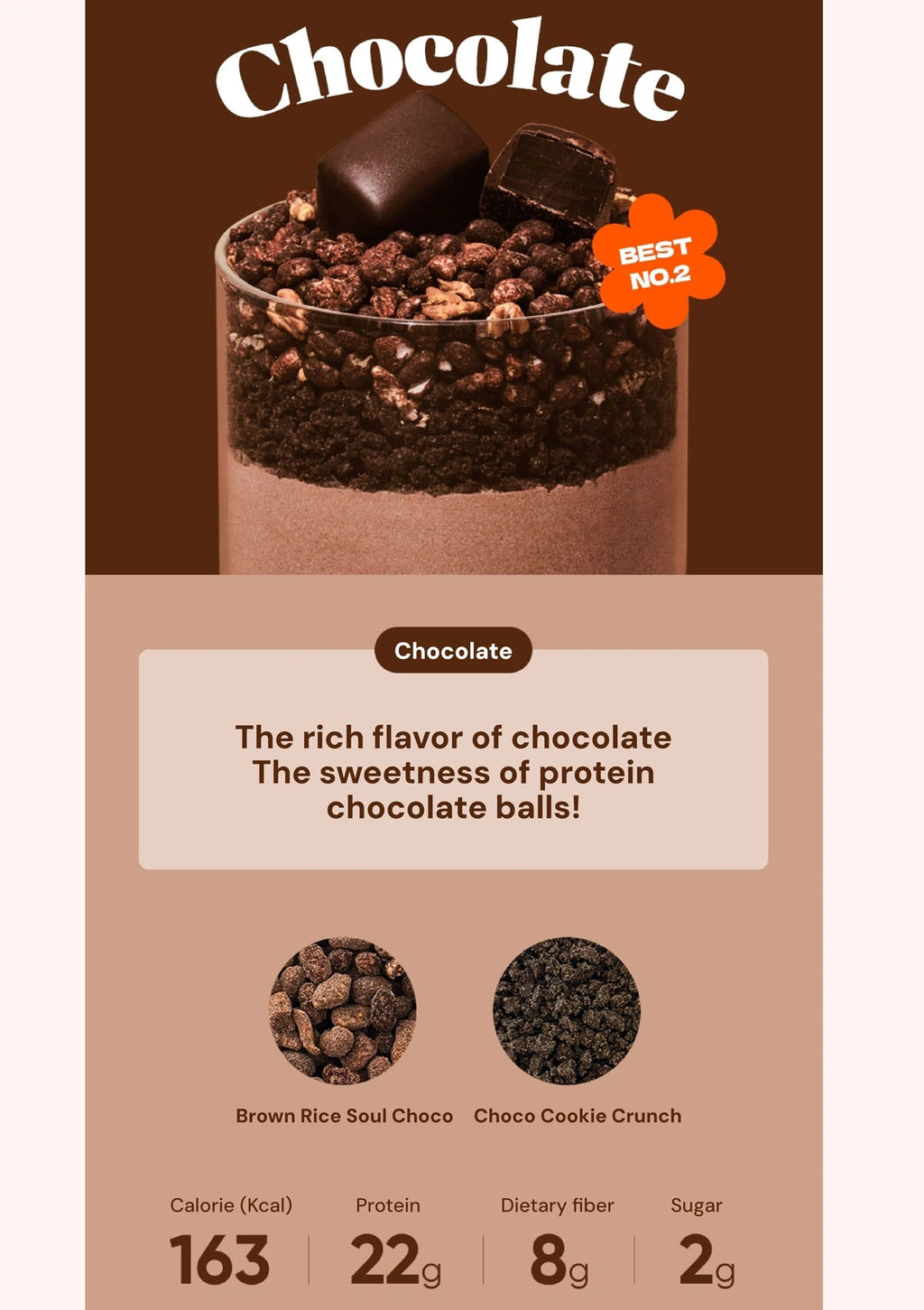 A rich, dessert-inspired protein shake made for chocolate lovers who want to stay healthy without giving up indulgence. Made with deep cocoa flavour and topped with cookie crumble and chocolate granola, it delivers a satisfying texture and taste experience. Each serving contains 163 kcal, 22 grams of protein, 8 grams of dietary fiber, and only 2 grams of sugar, making it an ideal choice for weight management, post-workout recovery, or a nutritious meal alternative. Shake Baby Chocolate is light, filling, and full of real flavour — the perfect daily shake to enjoy guilt-free.