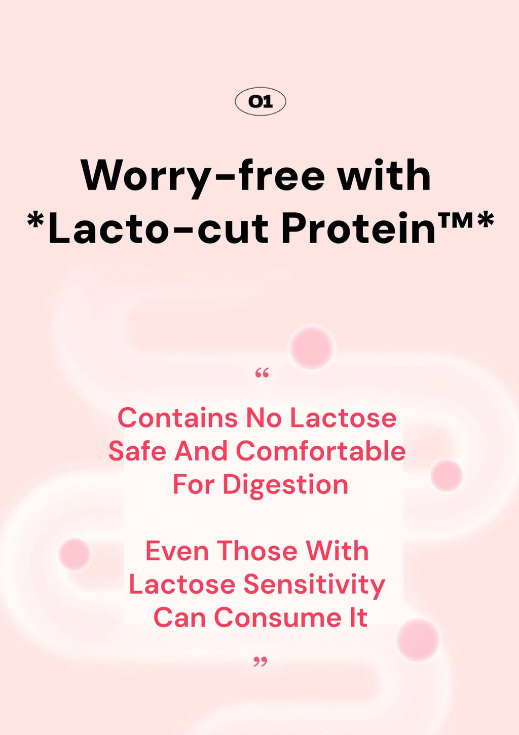 Pink protein supplement container with 'Lacto-Cut Protein' branding on a pink background.