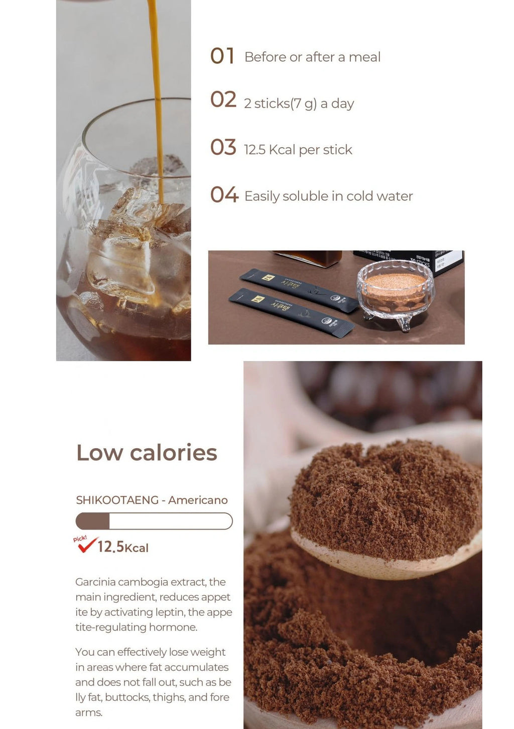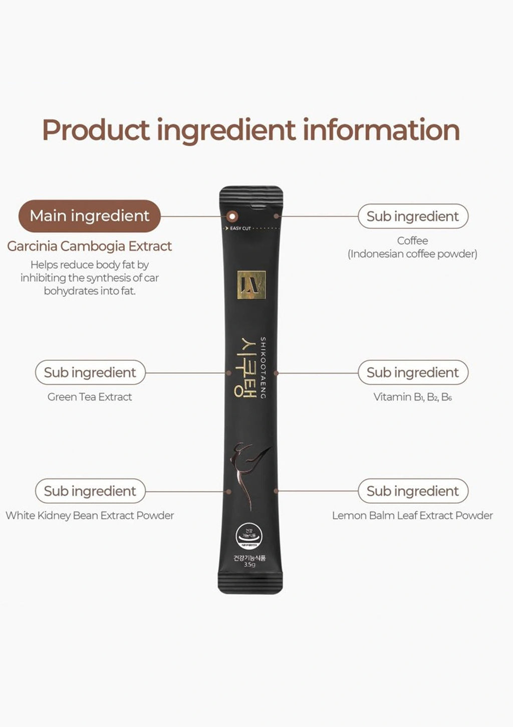 Garcinia Cambogia Extract (HCA 60%), Coffee (Instant Coffee 99%, Coffee 1%), Maltodextrin, Coffee flavor (Coffee powder flavor), Beta-Cyclodextrin, Silicon dioxide, Green Tea Extract Powder, Polydextrose, Vitamin C (L-Ascorbic Acid), White kidney bean extract, Lemon balm leaf extract (Lemon balm leaf extract 80%, Maltodextrin 20%), Pyridoxine hydrochloride (Vit b6 82%), Thiamine Mononitrate (Vit B1 81%), Riboflavin