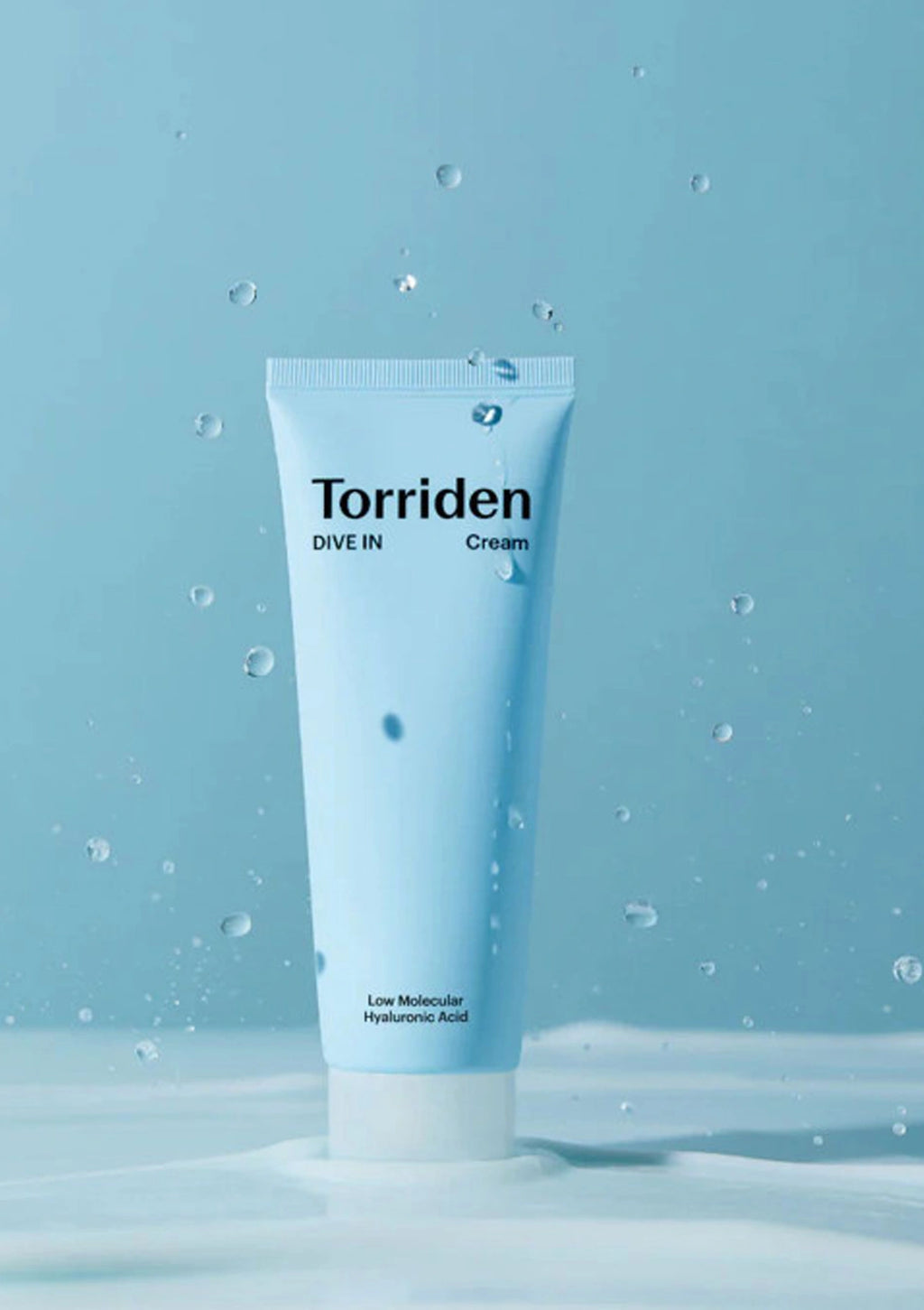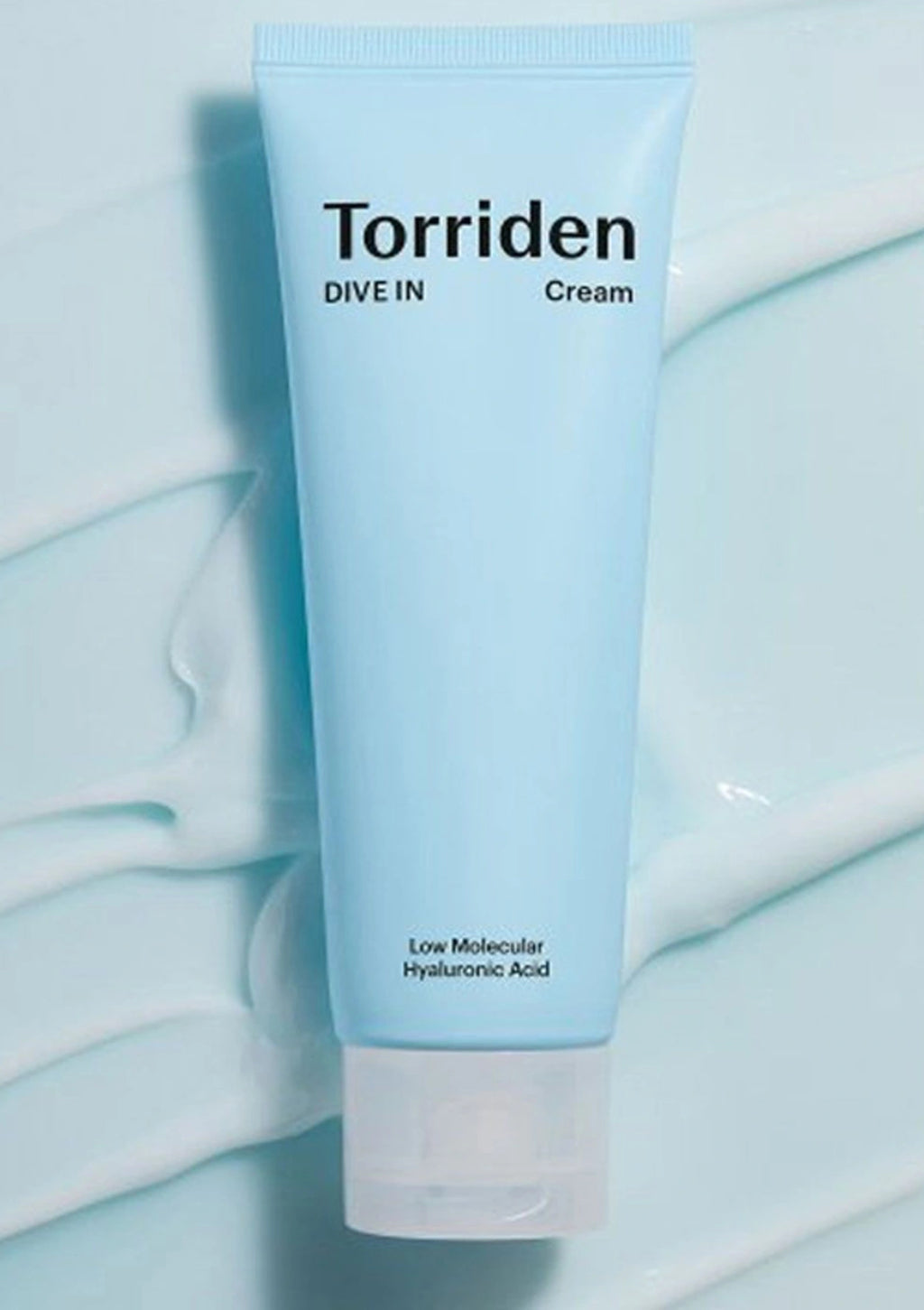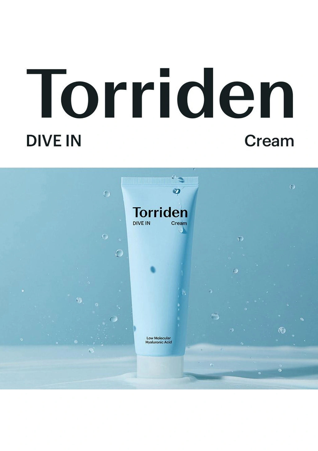 Torriden cream tube on a blue background with 'Dive In' text