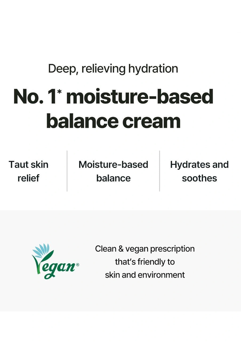 Advertisement for a moisture-based balance cream with text and a vegan logo on a white background.