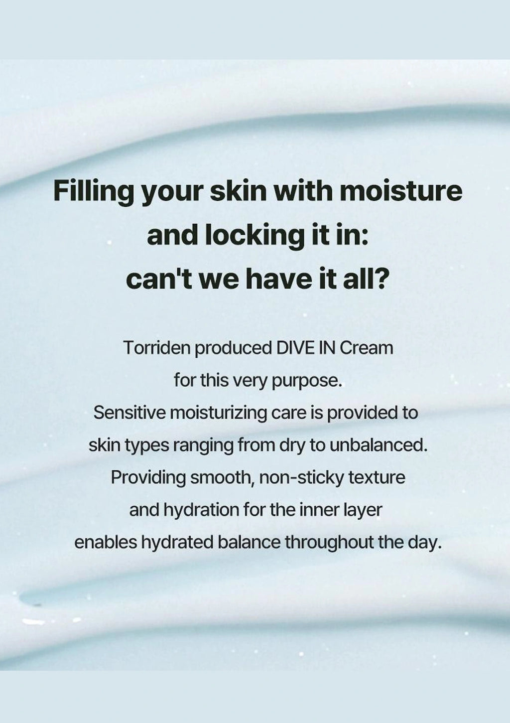 Text about Torriden DIVE IN Cream moisturizing benefits on a light blue background